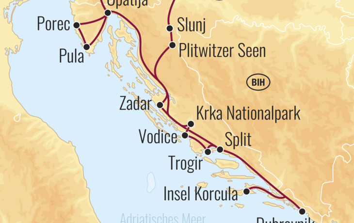 Freuen Sie sich auf eine seit vielen Jahren bewährte und beliebte Rundreise an die wunderschöne Küste Kroatiens. Das Land ist reich an Kultur- und Naturschätzen, die in Europa noch weitgehend unentdeckt sind. Wussten Sie, dass Kroatien ebenso viele von der UNESCO anerkannte Sehenswürdigkeiten besitzt wie Ägypten - eines der kulturschatzreichsten Länder der Welt? Während dieser Reise bringen wir Ihnen all diese imposanten Kultur- und Naturdenkmäler - und noch vieles mehr - näher. Die Route führt vorbei an majestätischen Bergketten und ihren Pässen, entlang kristallklarer, smaragdgrüner Flüsse und durch die urwüchsigen Wälder der Nationalparks. Selbstverständlich besichtigen wir auch die UNESCO-Welterbestätten des Landes. Nicht ohne Grund zählt die Ostküste der Adria zu den saubersten und schönsten Küsten des Mittelmeers. Freuen Sie sich auf unberührte Landschaften, charmante Küstenorte und komfortable 3*/4* Hotels, die Ihre Rundreise zu einem unvergesslichen Erlebnis machen.