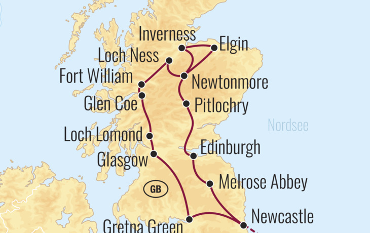 Lassen Sie sich verzaubern von den atemberaubenden schottischen Highlands und entdecken Sie imposante Burgen - vielleicht begegnet Ihnen sogar das sagenumwobene Ungeheuer von Loch Ness! Faszinierende Städte wie Glasgow und Edinburgh werden Sie ebenso begeistern wie die einzigartigen Landschaften der Highlands, die mit ihren geheimnisvollen Seen, tiefen Tälern und sanften Hügeln ein unvergessliches Panorama bieten. Tauchen Sie ein in die Welt der Clans und Tartans und erkunden Sie mit uns die berühmten Seen wie Loch Lomond oder Loch Ness. Ein besonderer Höhepunkt ist der Besuch der berühmten Hochzeitsschmiede in Gretna Green - ein Ort voller Romantik und Tradition. Ein weiteres außergewöhnliches Highlight dieser Schottland-Reise ist das weltberühmte Edinburgh Military Tattoo - die spektakulärste Militärparade der Welt. Weltweit verfolgen rund 100 Millionen Zuschauer das Event am Bildschirm, doch Sie sind live dabei: Einer der etwa 217.000 Besucher, die während der dreiwöchigen Saison auf der Esplanade vor dem Edinburgh Castle nicht nur zuschauen, sondern Teil des einzigartigen Ereignisses werden. Mit Darstellern aus über 30 Ländern begeistert das Tattoo seit 1950 ein internationales Publikum und gilt als kultureller Höhepunkt Schottlands. Kein Wunder, dass rund 35% der Zuschauer aus dem Ausland kommen und das Event in über 30 Ländern live verfolgt werden kann. Die Veranstalter legen großen Wert auf das internationale Flair und die Vielfalt der Darsteller, sodass jeder Besucher, egal woher er kommt, ein unvergessliches Erlebnis geboten bekommt. Sichern Sie sich schnell Ihre Plätze - diese Reise ist stets ausgebucht und verspricht ein einmaliges Abenteuer in Schottland!